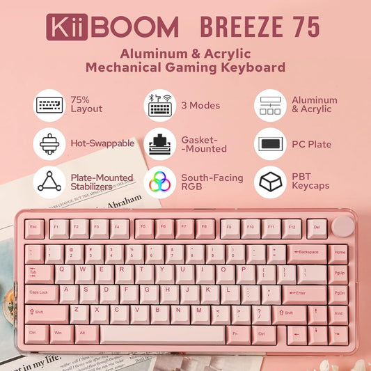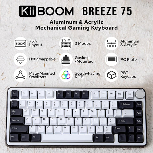 KiiBoom - Breeze 75 75% CNC Aluminum and Acrylic Mechanical Gaming Keyboard, Usb-C/Bt5.0/2.4Ghz Wireless Creamy Keyboard, with Gasket Structure, RGB, 8000Mah Battery for Win/Mac (Black) - Serious Techies