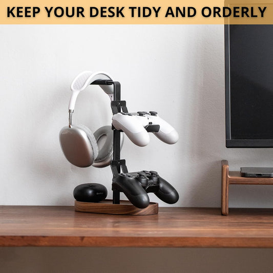 muso - 2-In-1 Gaming Controller Stand, Headphone Stand, Walnut Controller Stand, Desktop Headset Stand for Game Controllers and PC Earphone Accessories - Serious Techies