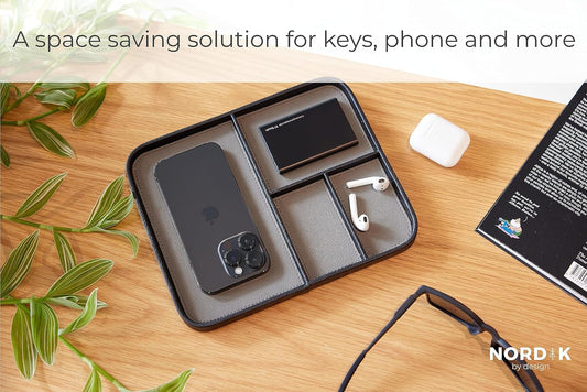 Nordik - Leather Valet Tray - Pebble Black - Premium Vegan Leather Stylish and Organised Nightstand Tray - EDC Catchall Tray for Keys, Watch, Wallet, Jewellery - Modern Bedside Caddy - Serious Techies