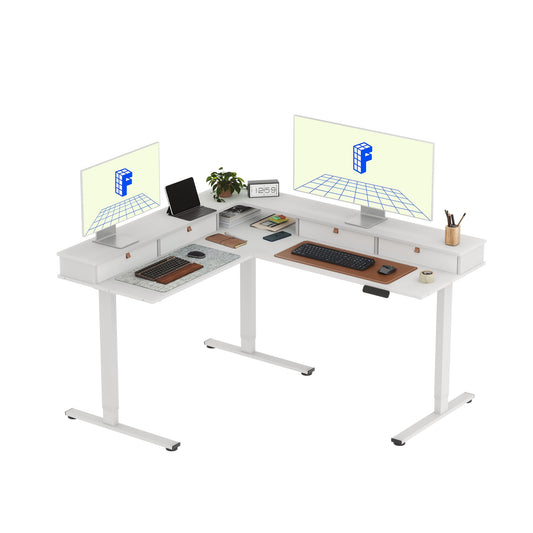 FLEXISPOT - 63 Inch L Shaped Standing Desk with Drawers and Shelf, Electric Adjustable Workstation with USB Charging for Home Office, White Top and Frame - Serious Techies