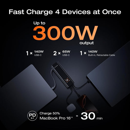 ECOFLOW - Rapid Pro Power Bank (27650Mah, 300W, 140W Built-In Cable), 4-Port Portable Charger W/ 140W Output, up to 320W Recharge, Compatible with Iphone Series, Samsung, Laptop and More - Serious Techies