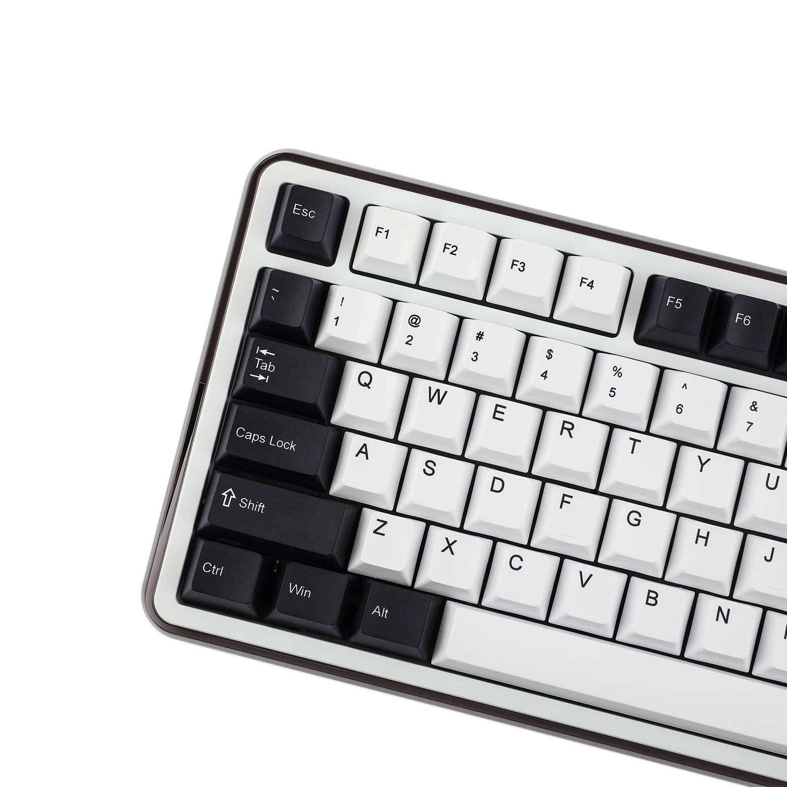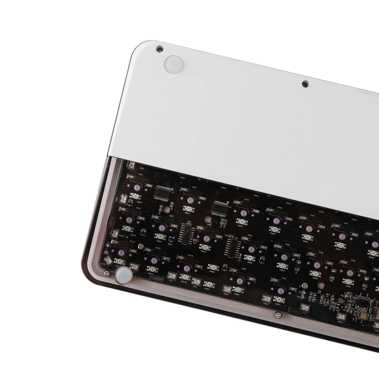 The Breeze 75 integrates metallic elements with transparent acrylic to create a unique aesthetic. The keyboard features cherry profile dye-sub PBT keycaps that coordinate with the color of the aluminum front piece while allowing the edge backlighting from the acrylic to shine through. The aluminum backweight not only adds to the aesthetic but also functions as a battery holder, with centrally located switches for easy toggling between Windows/Mac, Bluetooth, 2.4GHz, and wired modes.