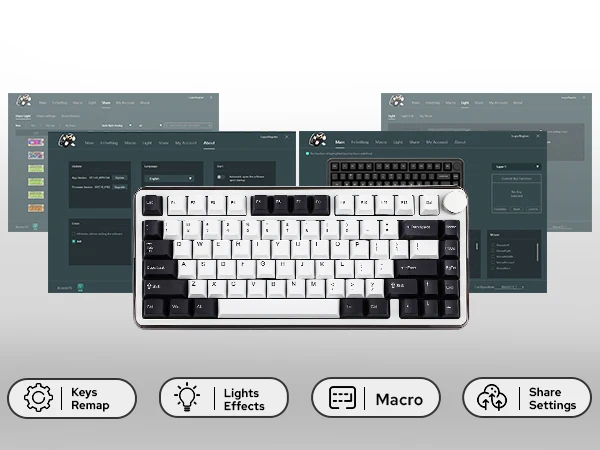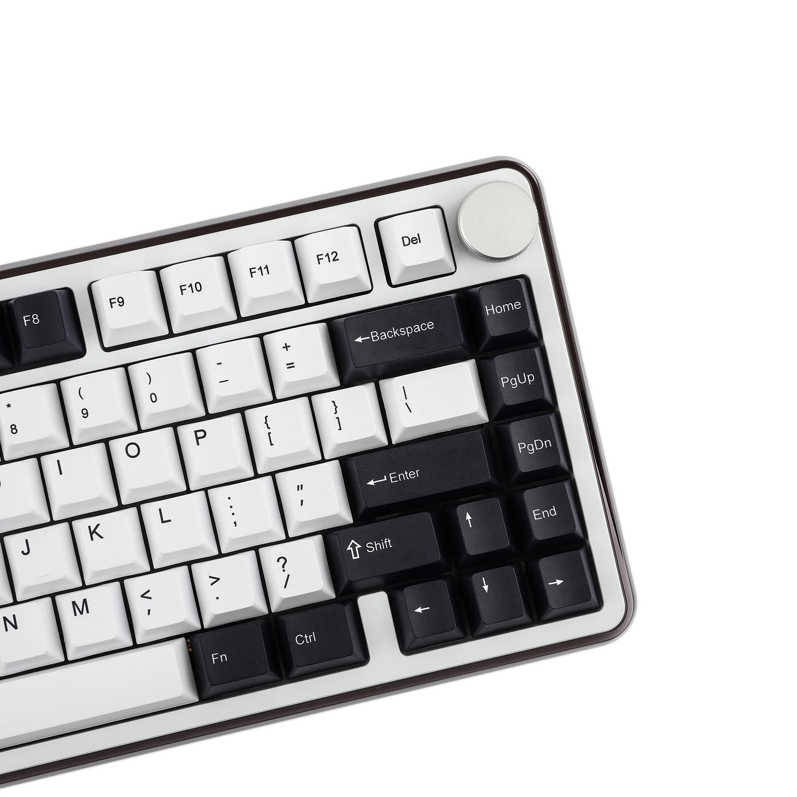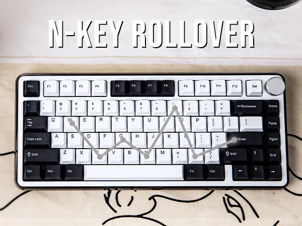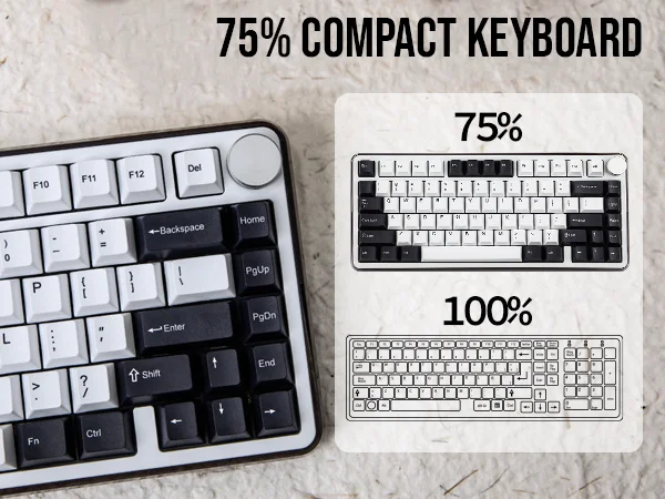 The KiiBOOM Breeze 75 mechanical keyboard has a 75% layout with 81 keys, making it compact without sacrificing the essential directional and function keys. This layout mirrors that of many laptop keyboards but with added functionality and improved ergonomics. A metal multifunctional knobis located on the top right corner which provides tactile feedbackwhen rotate and can be used to adjust backlight colors or control volume, enhancing both functionality and user experience.