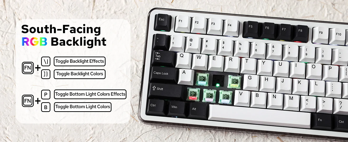 The Breeze 75 offers extensive customization with 22 RGB and 6 backlight effects, allowing users to personalize their setup to match their aesthetic preferences or ambient lighting conditions.