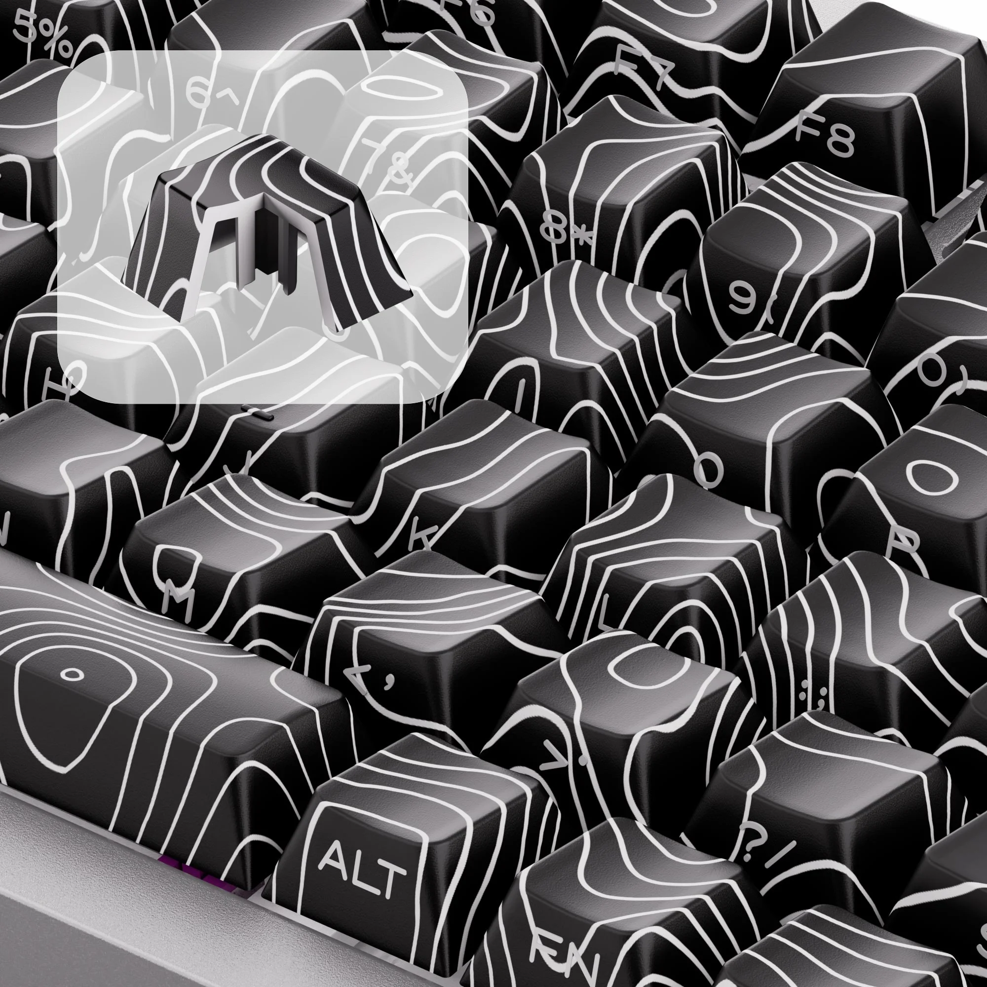 Introducing the contour line-themed keyboard, inspired by natural terrain to enhance your typing experience. Featuring a striking gradient color scheme that simulates elevation changes, each keycap showcases intricate contour line patterns and varying heights for a three-dimensional effect.