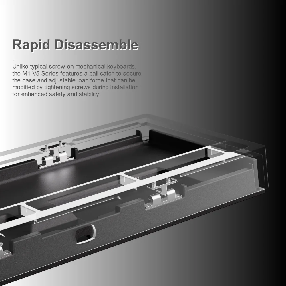 Unlike typical screw-on mechanical keyboards, the M1 V5 Series features a ball catch to secure the case and adjustable load force that can be modified by tightening screws during installation for enhanced safety and stability.