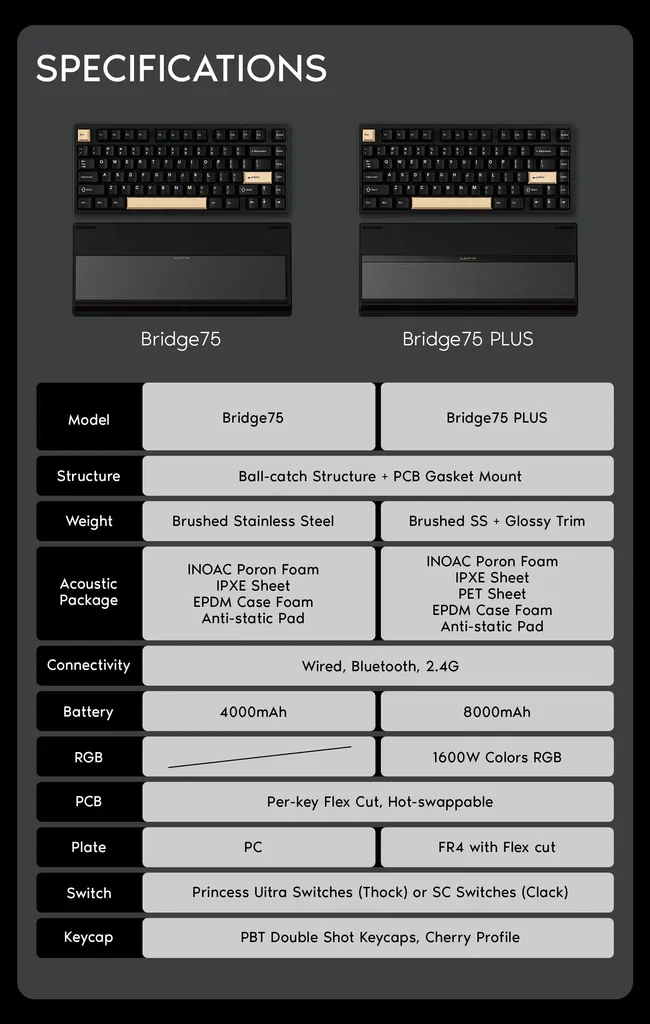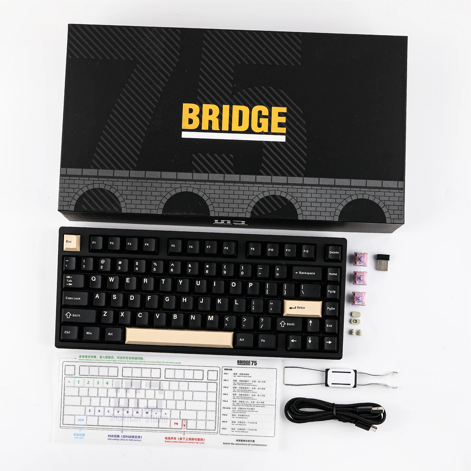 Crafted with a CNC aluminum top case and a solid steel bottom, the Bridge75 keyboard offers a durable, high-end design that stands up to years of heavy use. The sleek, minimalist build is reinforced with a full metal frame, giving the keyboard a premium feel while ensuring exceptional sturdiness. This robust construction minimizes internal component movement, extending the keyboard's lifespan and improving sound quality.